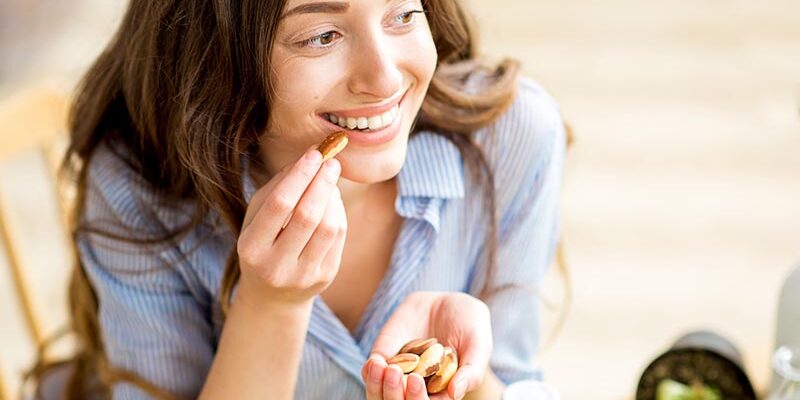 Erdnüsse, Mandeln, Cashews und Walnüsse enthalten unterschiedliche Stoffe wie Kalzium, Vitamine, Eisen, Magnesium, Zink und vieles mehr, die sich positiv auf Zähne und Zahnfleisch auswirken. Das intensive Kauen regt zudem die Speichelproduktion an. Mehr Speichel umfließt die Zähne und verdünnt so die zahnschädlichen Säuren, die von den Bakterien auf der Zahnoberfläche produziert werden. Das im Speichel enthaltene Kalzium remineralisiert dabei den Zahnschmelz. Doch Achtung: Durch den hohen Fettgehalt sind Nüsse sehr kalorienreich, deshalb reicht eine kleine Menge aus.